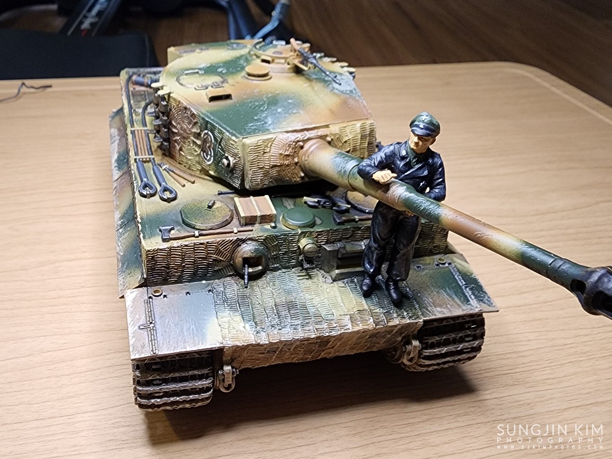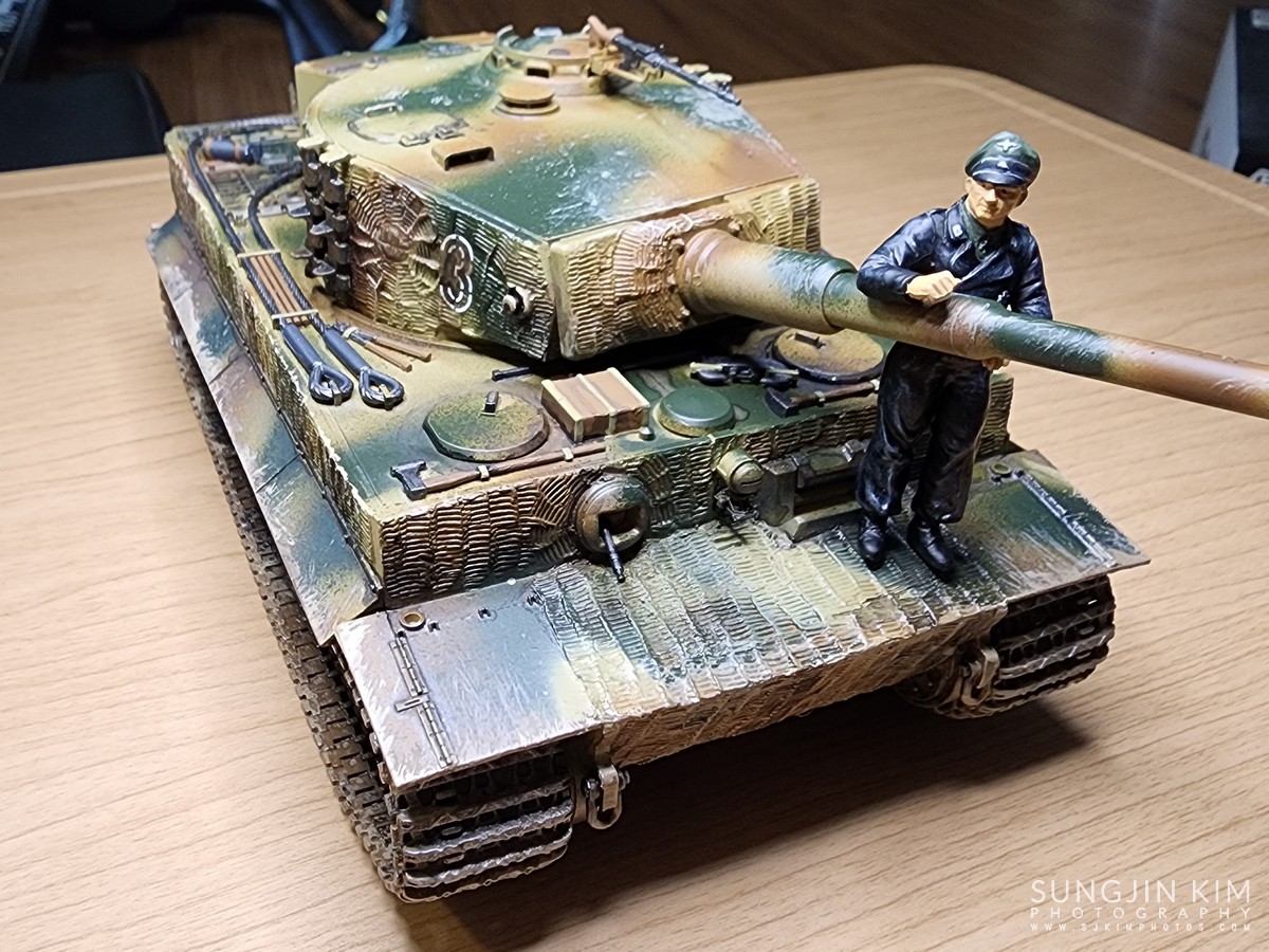 탱크의 모든 디테일한 부분을 도색하고 전차병까지 완성하여 포즈를 취한 모습.