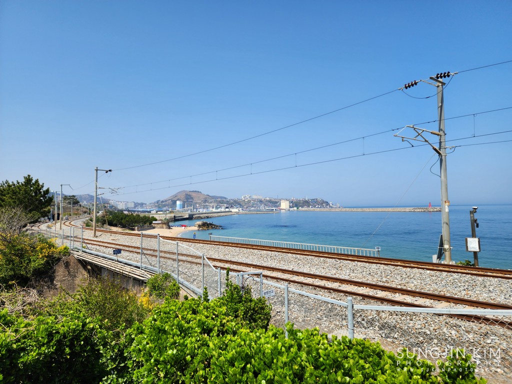 기차길 옆으로 보이는 파란 동해 바다...