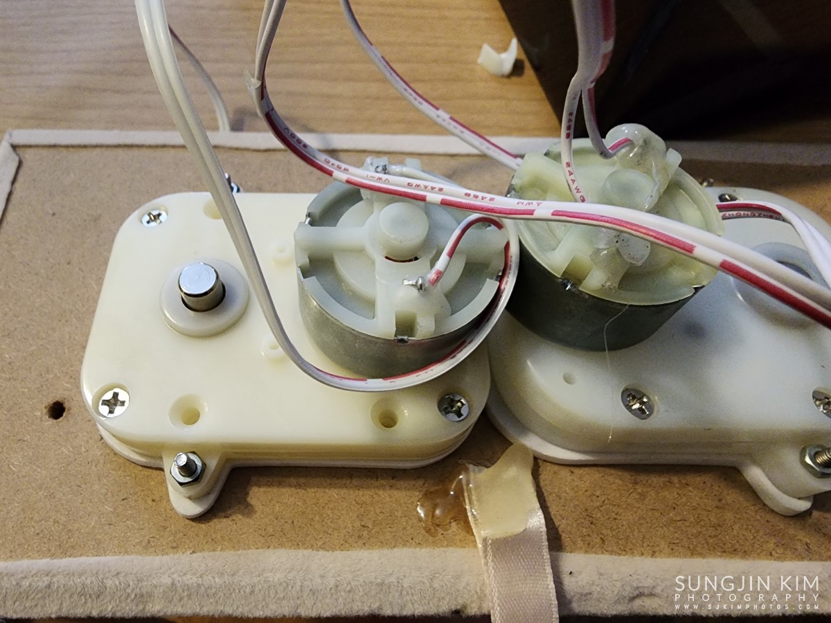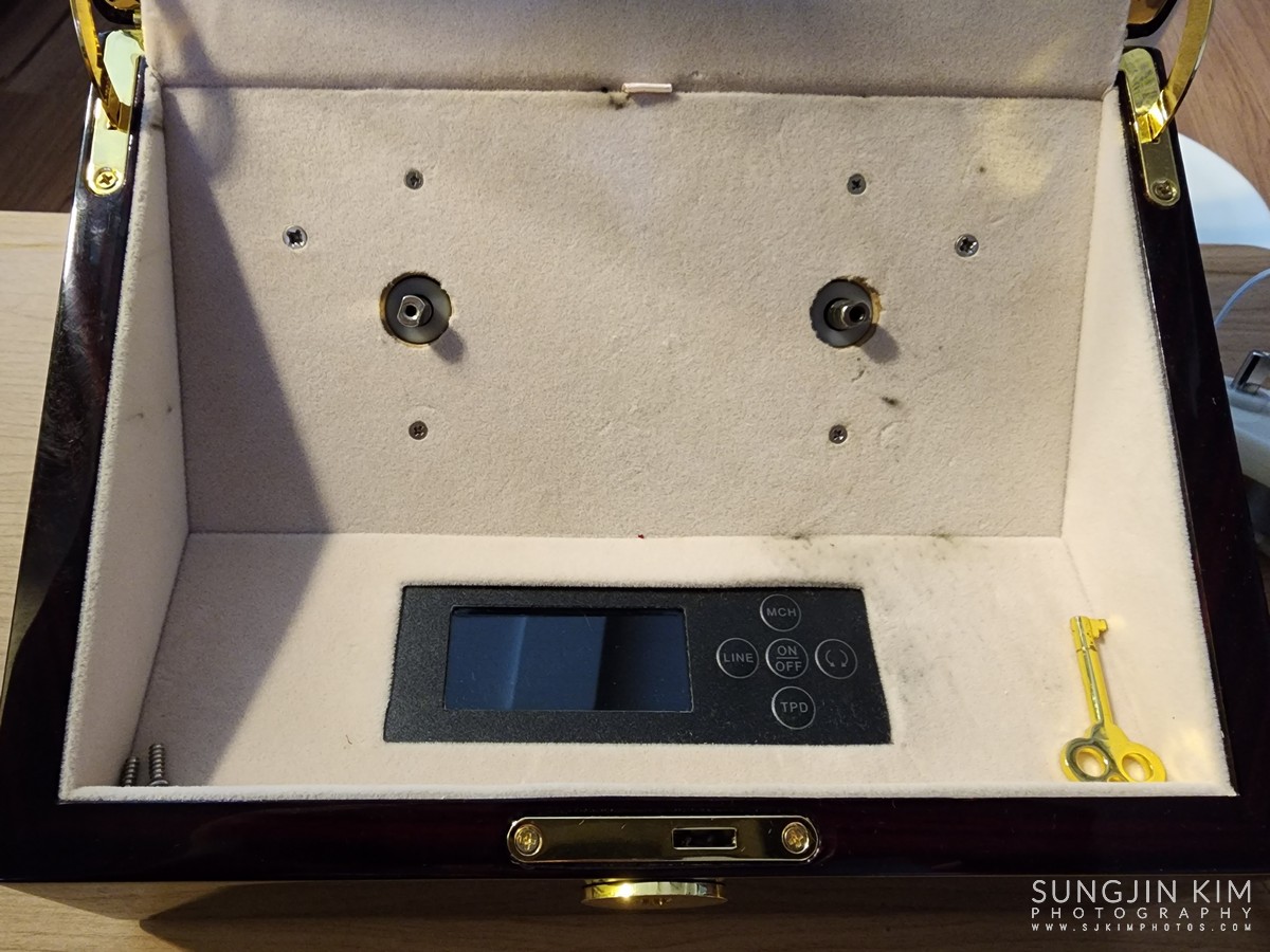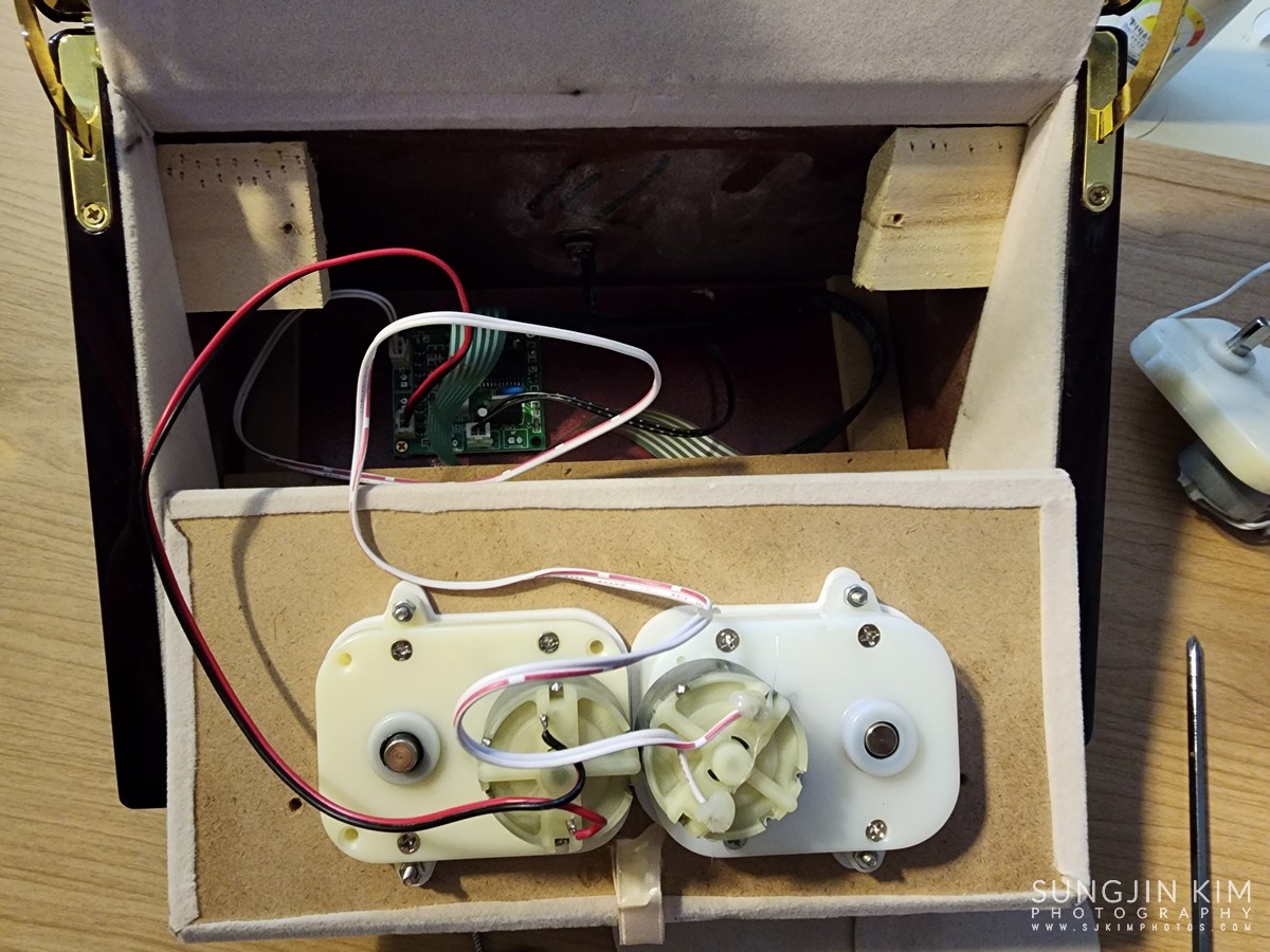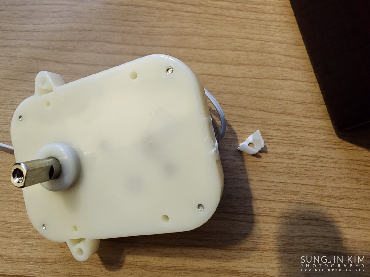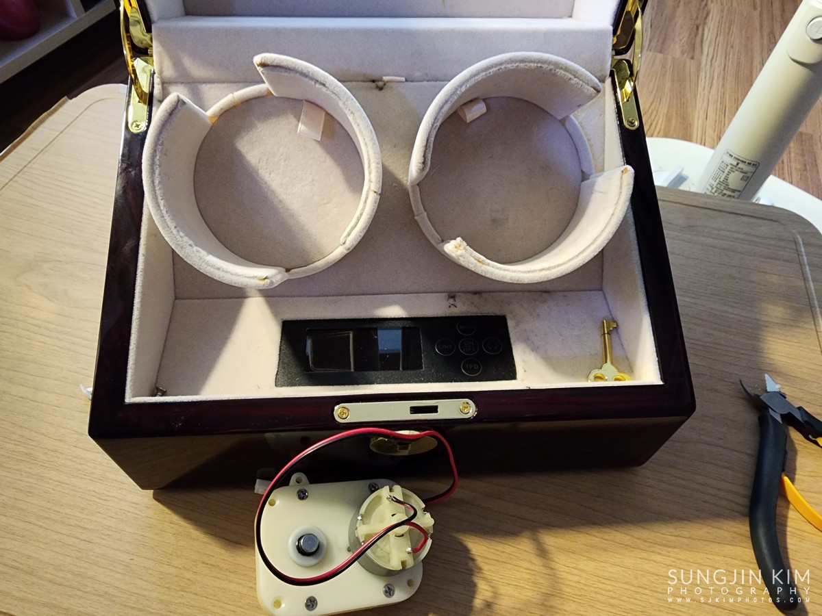 고장부위를 찾아보기 위해 분해한 워치 와인더. 2구짜리 워치 와인더이기 때문에 두 개의 모터 모듈이 장착되어 있다.