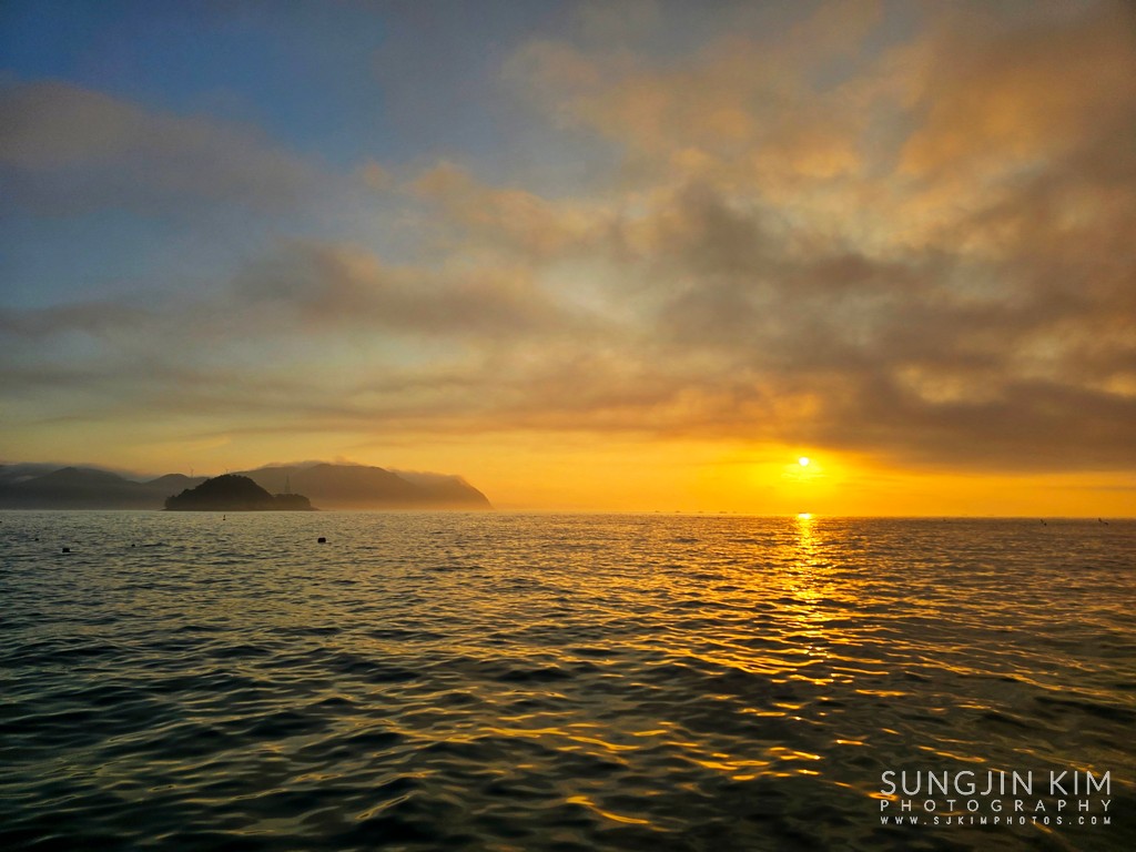 섬 뒤편으로 붉은 일출이 서서히 올라온다.