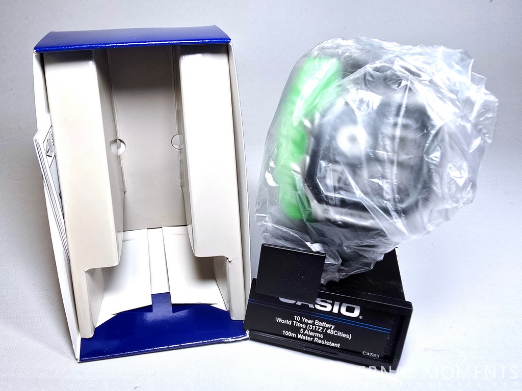 각인: 케이스와 디스플레이 주변에 'WORLD TIME', '5 ALARMS', 'CASIO', 'LIGHT', 'SEARCH', 'ADJUST', 'MODE', 'WR100M', '10 YEAR BATTERY', 'ILLUMINATOR' 등 주요 기능과 브랜드 명이 명확하게 각인되어 있습니다.