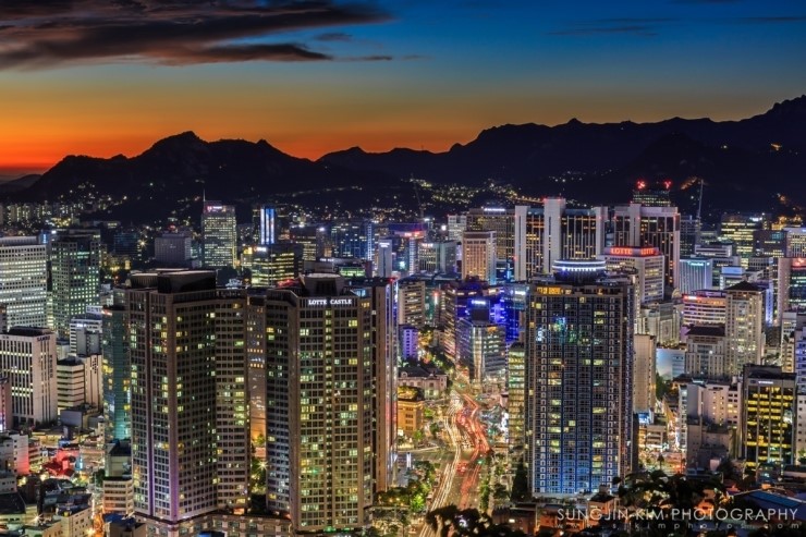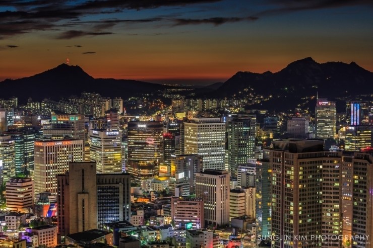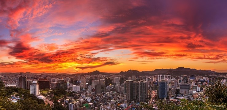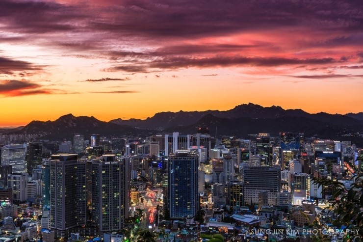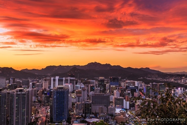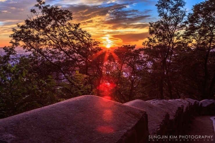 일몰시간이 가까워진 시간에 한참을 기다려 탄 남산을 오르는 순환버스가 이날 따라 더욱더 거북이 느림보처럼 느껴졌다. 버스에서 내리자마자 발걸음이 느린 와이프와는 나중에 만나기로 하고 촬영포인트로 미친 듯이 땀을 흘리며 달렸다. 이미 해는 지평선 너머로 내려가고 있었고 하늘은 119라도 불러야될 만큼 불타고 있었다. 급한 와중에 남산도서관쪽으로 내려가는 계단 방향에 있는 잠두봉 포토아일랜드의 위치가 이날 따라 제대로 생각이 나지 않아 케이블카 타는 곳 부근에서 헤매고 있었다. 그렇게 시간을 허비했지만 다행히 평소에는 담을 생각도 못했던 구도의 사진도 담게 되어서 다행이었다.