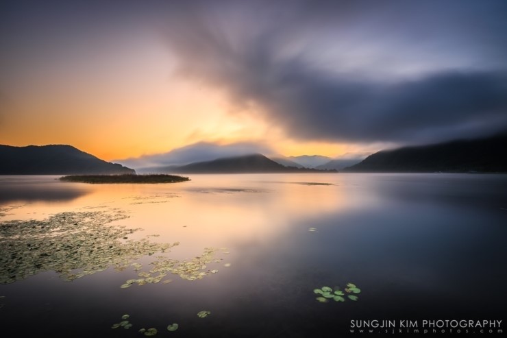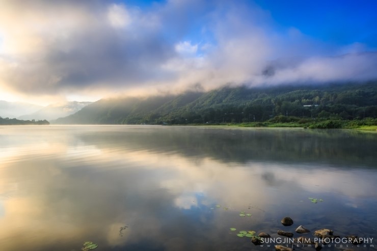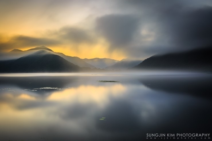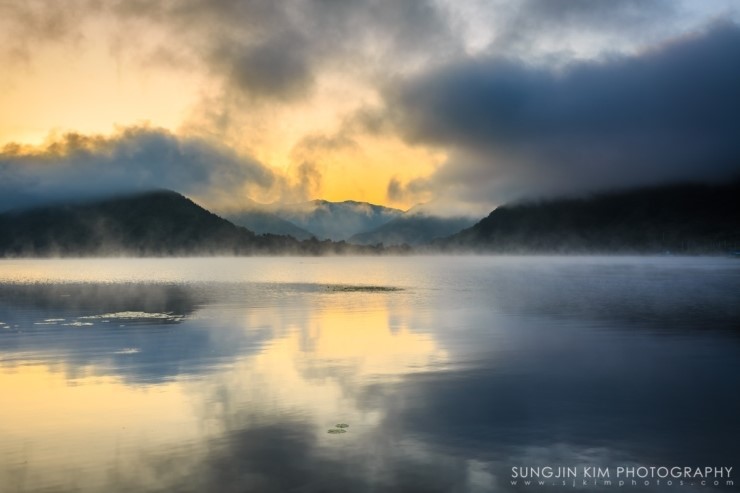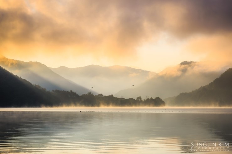 춘천에서 화천으로 넘어가는 국도를 달리면서 그 아름다운 풍경에 늘 감탄만 하다가 드디어 마음먹고 지도를 보고 나름대로 포인트를 잡았다. 양구의 국토정중앙천문대에서 서울로 돌아오는 새벽길에 미리 찾아두었던 강변의 포인트에 들려 자리를 잡고 해가 나오기만을 기다렸다. 늦은 여름임에도 산이 많은 강원도라 꽤 쌀쌀한 새벽이었다. 능선 너머로 여명이 밝아 오면서 강위는 마치 목욕탕을 연상케 할 정도의 물안개가 피어나고 하늘의 구름은 강을 따라 역동적으로 움직이고 있었다. 자리잡고 기다린 보람이 있는 순간이었다.