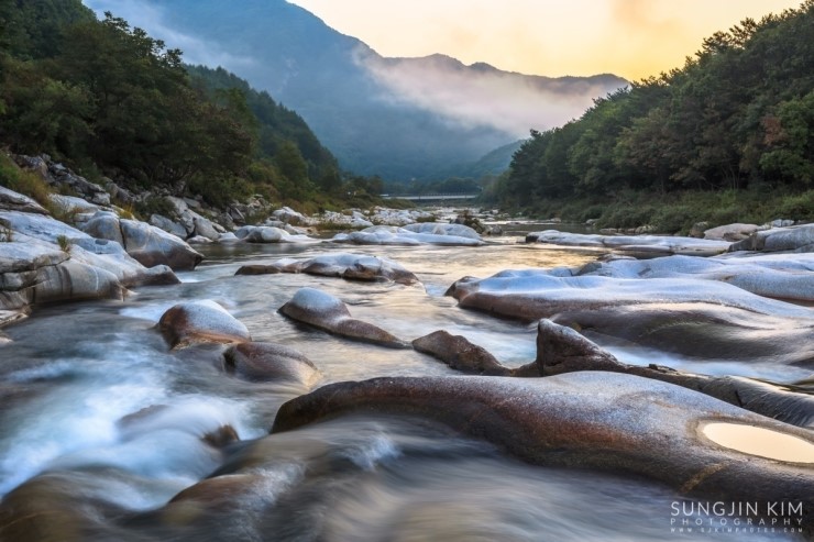 철원에서 은하수 촬영을 마치고 그냥 서울로 돌아오긴 왠지 아쉬워서 가까운 화천의 곡운구곡에서 아침 풍경을 담기 위해 새벽3시에 이동했다. 곡운구곡이 워낙 길어서 몇 군데 들려서 촬영할 만한 위치를 찾다가 제3곡 신녀협에서 좋은 위치를 찾아 아침이 밝기를 기다리며 차에서 1시간 정도 쪽잠을 자며 기다렸다. 피곤했었는지 금방 곯아떨어져서 알람이 울리는 소리에 놀라 깨어났는데 저 멀리 계곡 끝에서 아름다운 오렌지빛의 여명이 밝아오고 있었다.