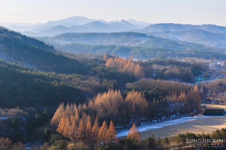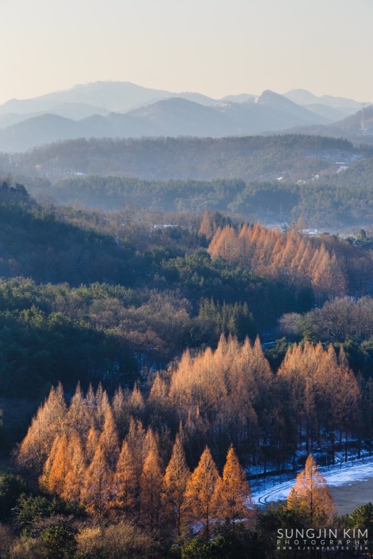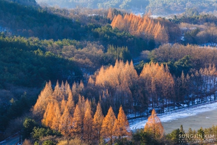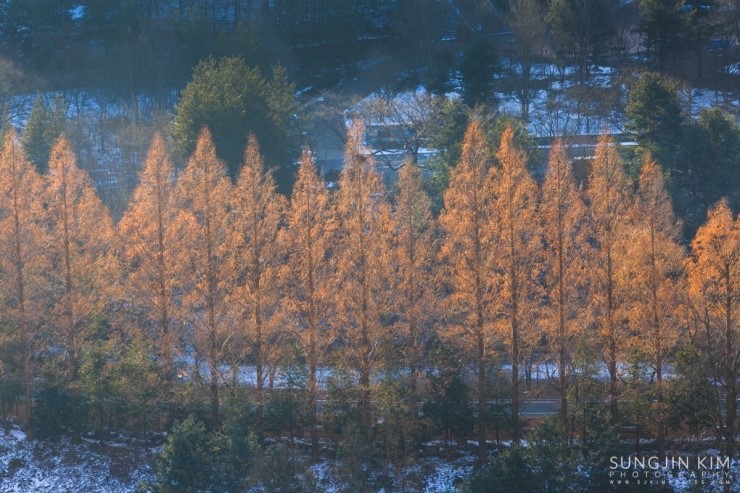 금강로하스의 풍경을 담고 서울로 올라가던 중 대청댐을 조망할 수 있는 전망대에 잠시 들려 내려다보니 눈에 띄는 풍경이 있었다. 나무 종류는 모르지만 줄지어 서 있는 모습이 마치 S라인을 연상시켰다.
