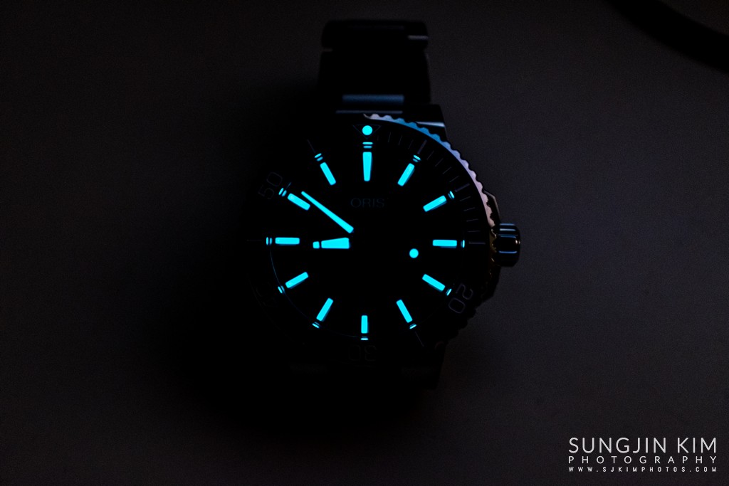 다이얼은 세련된 요소가 많지만 핸즈, 마커, 배경의 대비가 높아 가독성이 매우 우수하다. 다이얼의 광택이 적용된 많은 요소는 시계를 더욱 고급스럽게 보이게 하여, 오리스 애퀴스 데이트가 럭셔리할 뿐만 아니라 진지한 시계로 거듭날 수 있도록 한다. 내가 가장 좋아하는 다이얼의 부분은 대칭과 날짜창(대칭으로 6시 위에 배치되고 일반적인 시계는 3시 위치에 배치됨)이 옆에 배치되는 시간 마커를 완전히 잘라내지 않는다는 것이다. 또한 검은색과 흰색의 디스크를 사용하여 날짜가 잘 어우러지는 부분도 주목할만 하다. Oris는 또한 다이얼에 "PRESSURE RESISTANT" 용어로 프린트하여 일반적이지 않은 표현을 사용한 점도 특이하다.