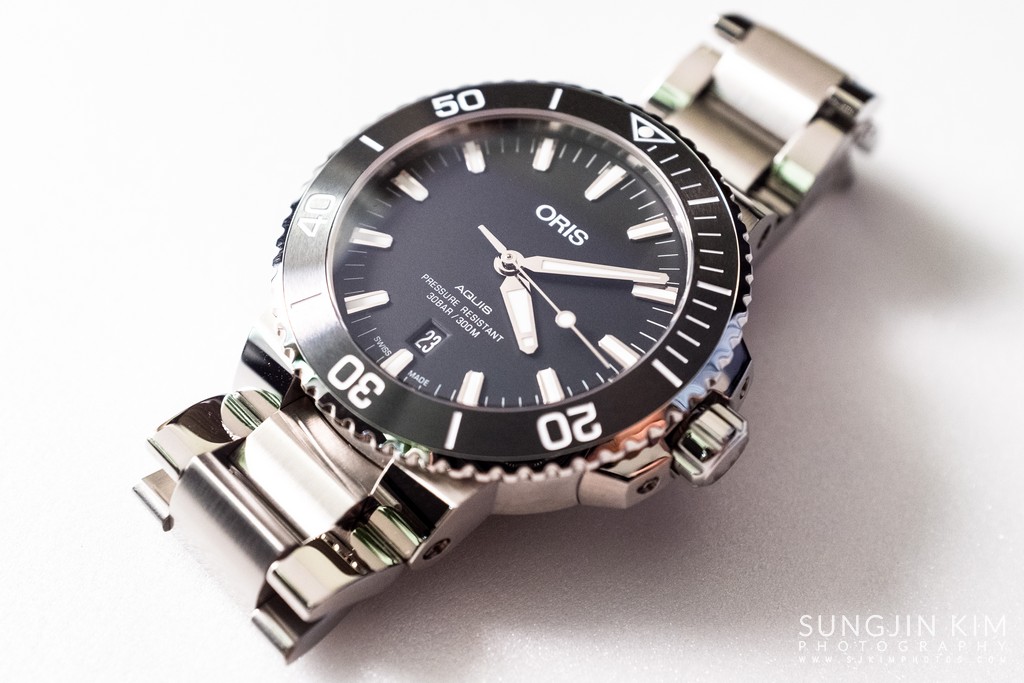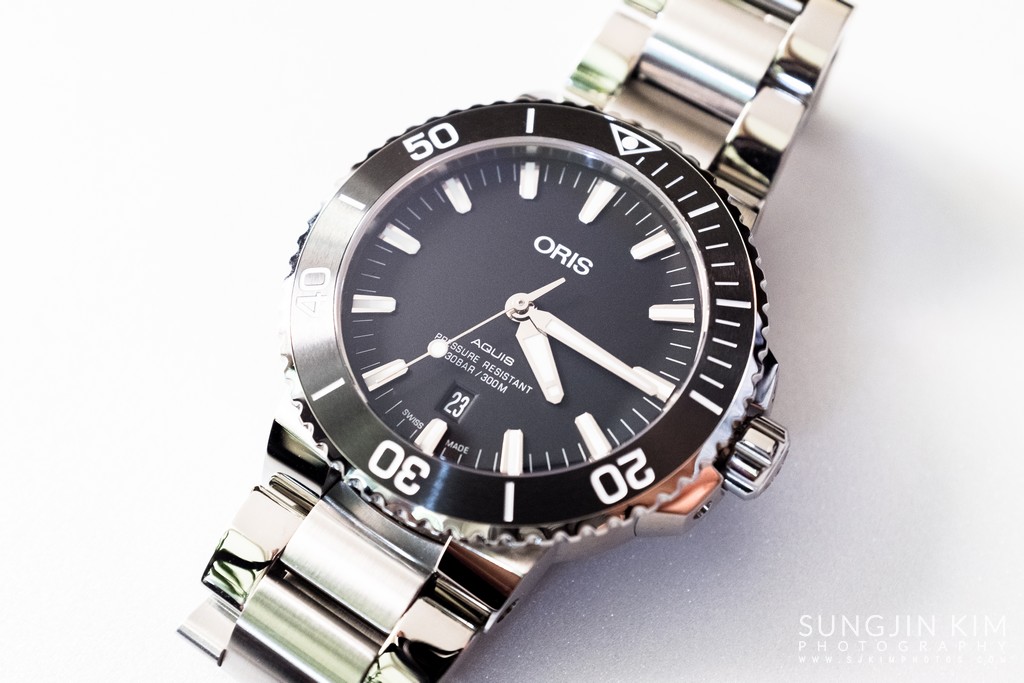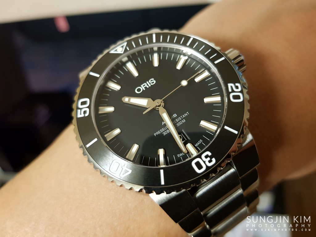 항상 이제 더 이상 시계를 사지 않고 다짐을 하지만 어느 순간 나도 모르게 홀린 듯 쇼핑몰에서 주문을 하게 된다. 그렇게 구매하게 된 시계는 중저가 다이버 시계 중에서 많은 인기 얻고 있는 레퍼런스 번호 01 733 7730 4154-07 8 24 05PEB의 Oris Aquis Date 43.5mm 크기에 블랙 다이얼과 블랙 세라믹 베젤이 적용된 모델이다.