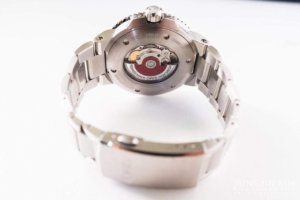 케이스 뒷면에는 시계 전면에 사용된 것과 동일한 사파이어 유리창을 통해 무브먼트의 작동 모습을 볼 수 있다. 다이버 시계에서는 무브먼트를 볼 수 있는 것이 흔하지 않기 때문에 이것은 좋은 기능이라고 볼 수 있다. 오리스는 그 무브먼트를 오리스 733이라고 부른다. 이 무브먼트는 스위스산 Sellita SW200-1이 기본 모델이다(ETA 2824-2의 복제 모델임). 무브먼트는 사실 장식이 화려하지는 않지만 상징적인 빨간색 오리스 자동 회전자를 가지고 있다. 이 무브먼트는 4Hz에서 작동하며 38시간의 파워 리저브를 제공한다. 한 가지 아쉬운 점은 오리스가 약간 더 성능이 우수한 SW300을 사용 했으면 하는 생각을 한다.