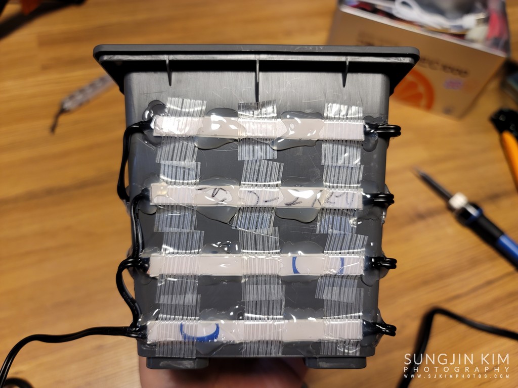 드디어 LED 스트립을 미리 뚫어놓은 구멍에 맞추어 필라멘트 테이프로 고정한 후에 글루건을 이용하여 움직이지 않도록 마무리한다.