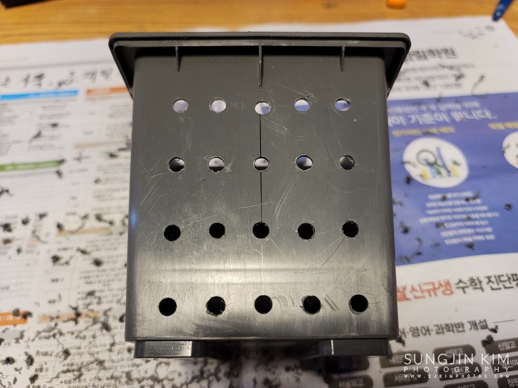 LED가 장착될 자리를 사전에 밑그림을 작성하여 4면에 모두 붙여 두었다. LED가 노출될 자리는 밑그림에 맞추어 송곳으로 표시를 해둔다.